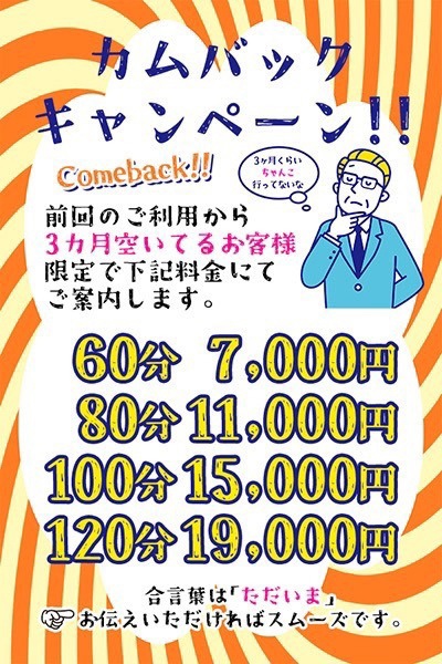 前回のご利用から3か月以上空いているお客様限定で下記料金にてご案内させていただきます!!!